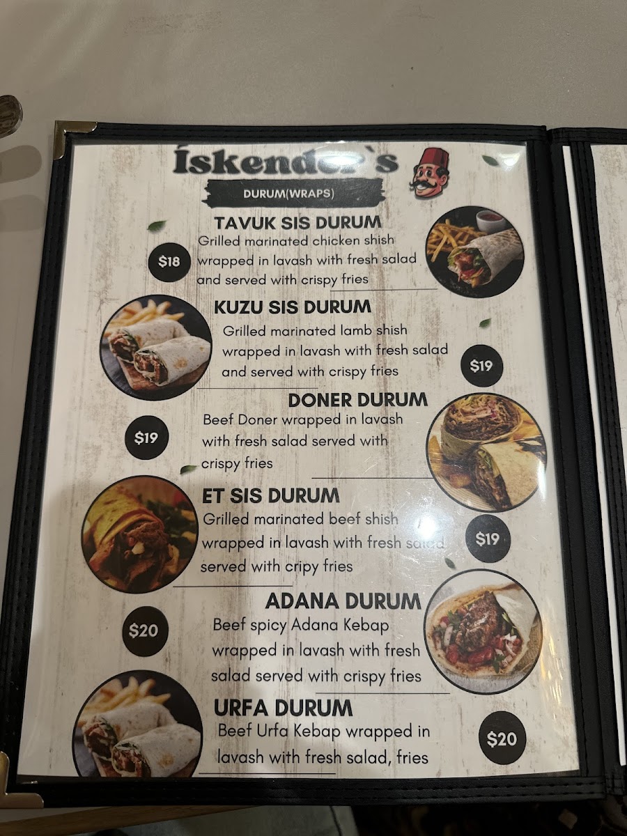 Eggplant, mushroom, onion, courgette, pepper, over charcoal,wrapped in a lavash bread with cheddar cheese and finished with the chef's special sauce and yogurt.