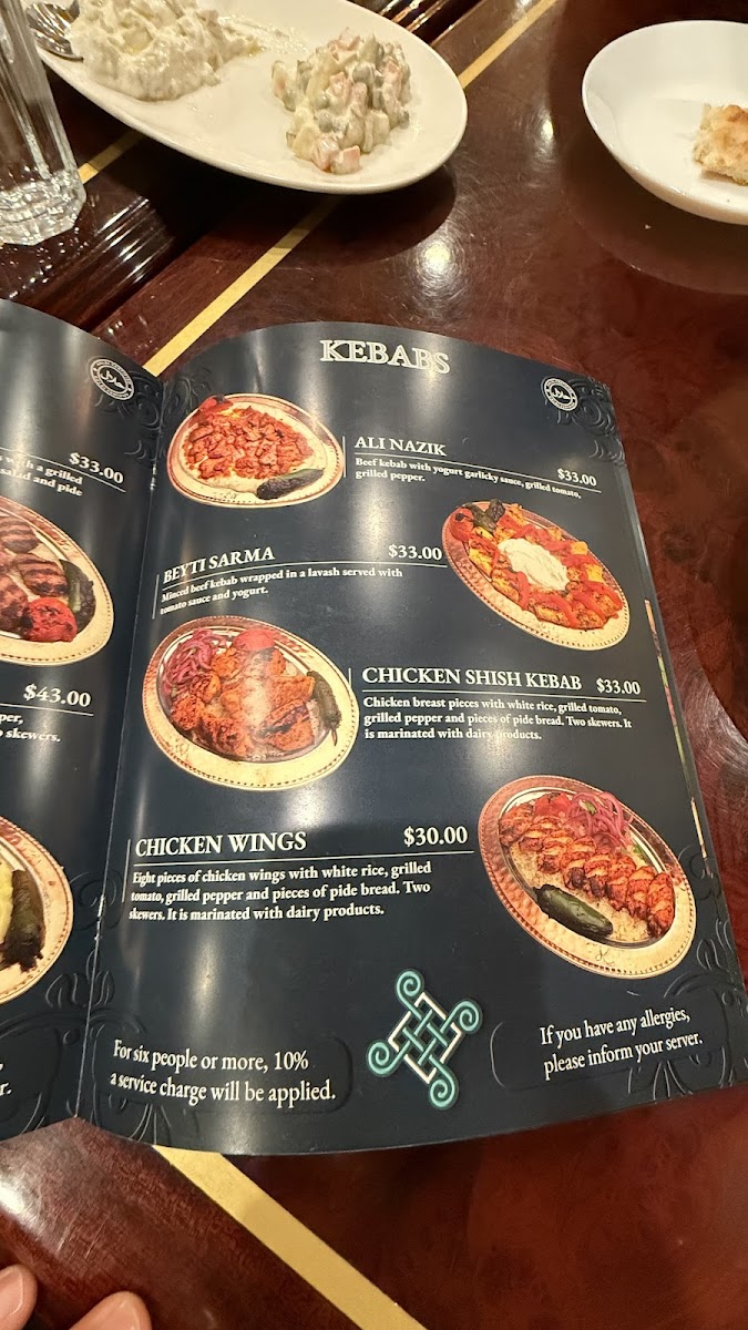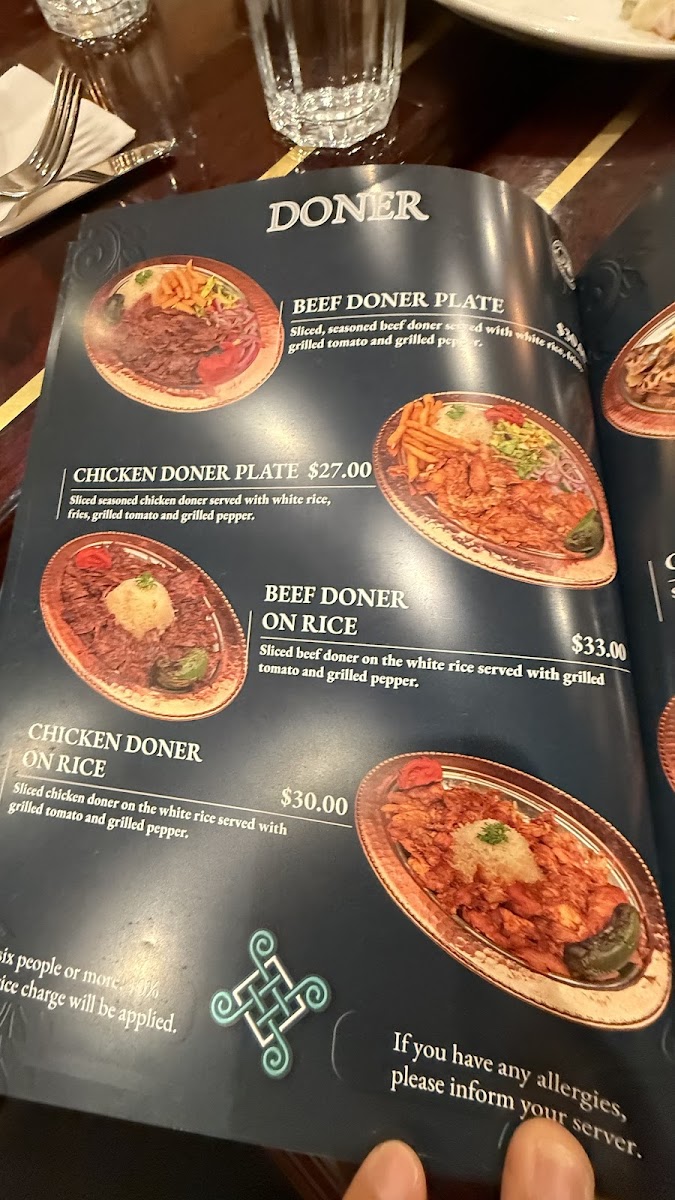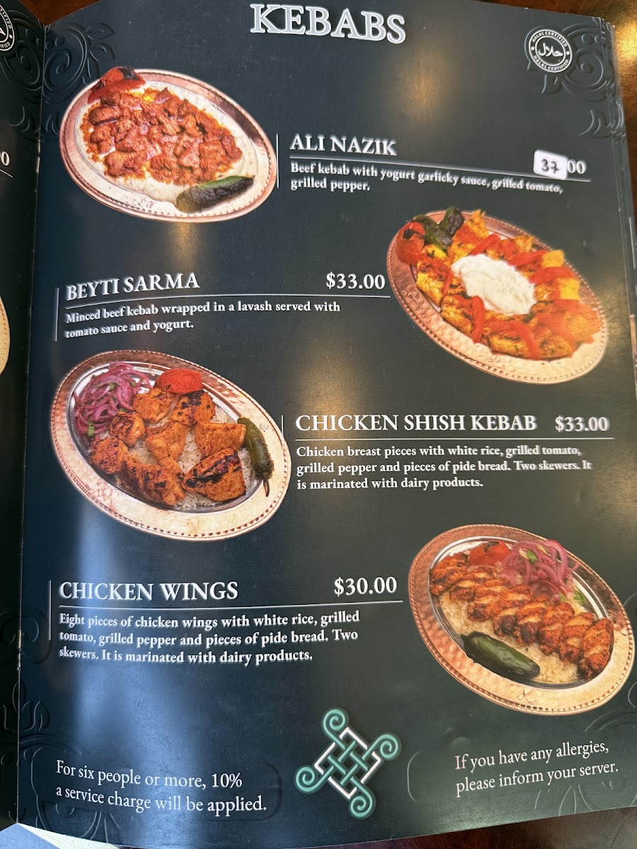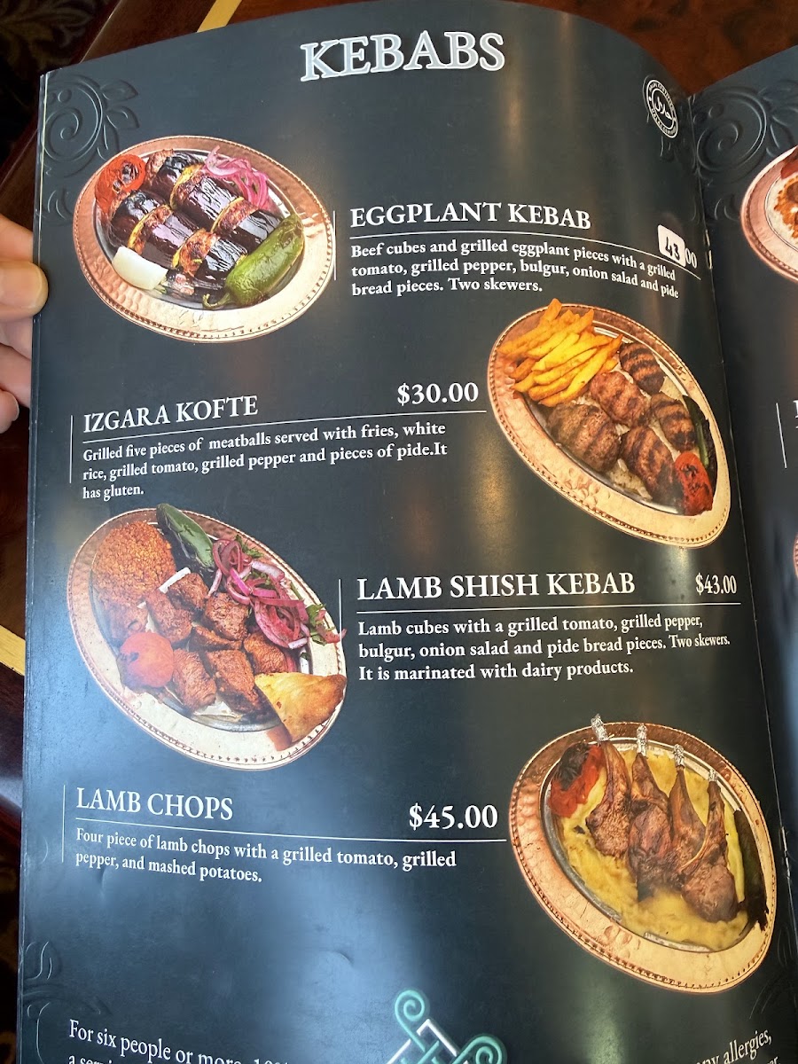 2 skewers of chicken shish kebab, 2 skewers of beef shish kebab, 2 skewers of adana and urfa kebab, 4 piece of lamb chops 4 piece of kofte meatballs, chicken doner and beef doner, bulgur and white rice.