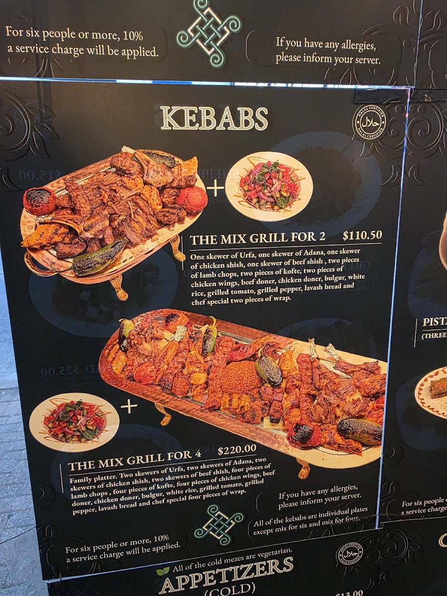 One skewer of Urfa, Adana, Chicken shish, Beef shish, two pieces of meatball(kofte), lamb chops, beef doner, chicken doner, white rice, bulgur, grilled tomato. grilled pepper and lavash bread. It comes with a salad.